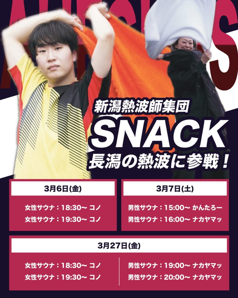 SNACKによる本格熱波、スタッフによる怒涛の熱波!さらにその他、サウナ好きを唸らせるイベントをご用意!