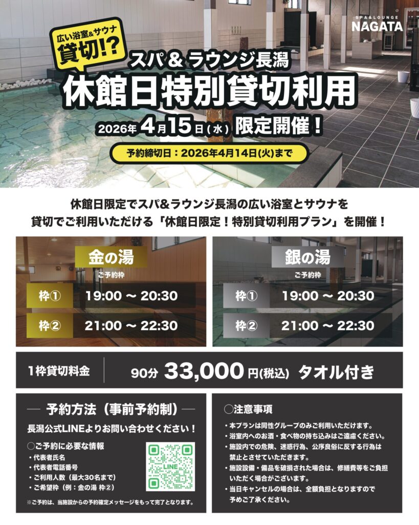 毎月第三水曜日は休館日となっているスパ&ラウンジ長潟ですが、2026年4月15日(水)限定で、広い浴室とサウンを貸切でご利用いただける「休館日特別貸切利用プラン」を開催いたします!