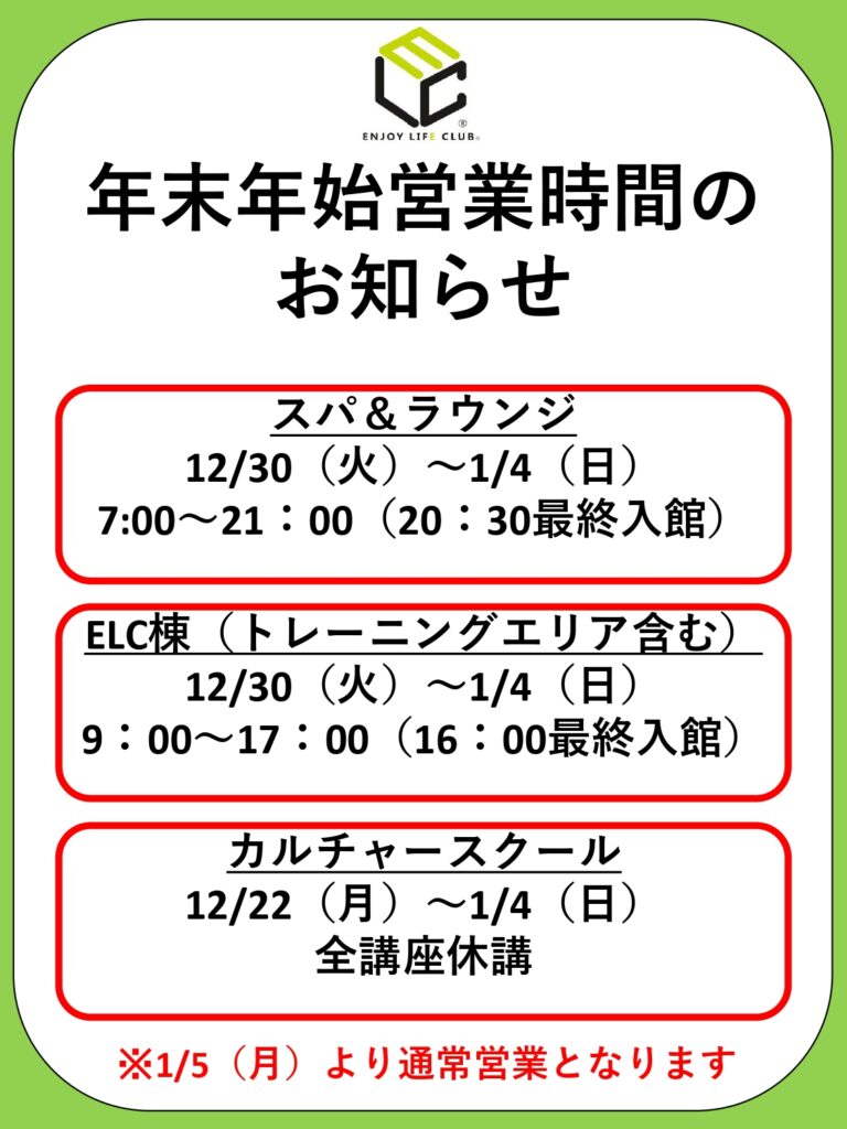 ELC長潟 2025-2026年末年始営業時間のご案内 - エンジョイ・ライフ・クラブ長潟